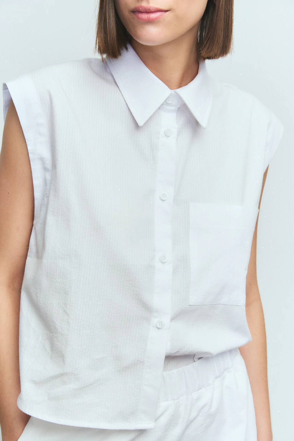 Camisa de silueta recta sin mangas. Bolsillo plaqué en delantero con detalle de bordado a tono.