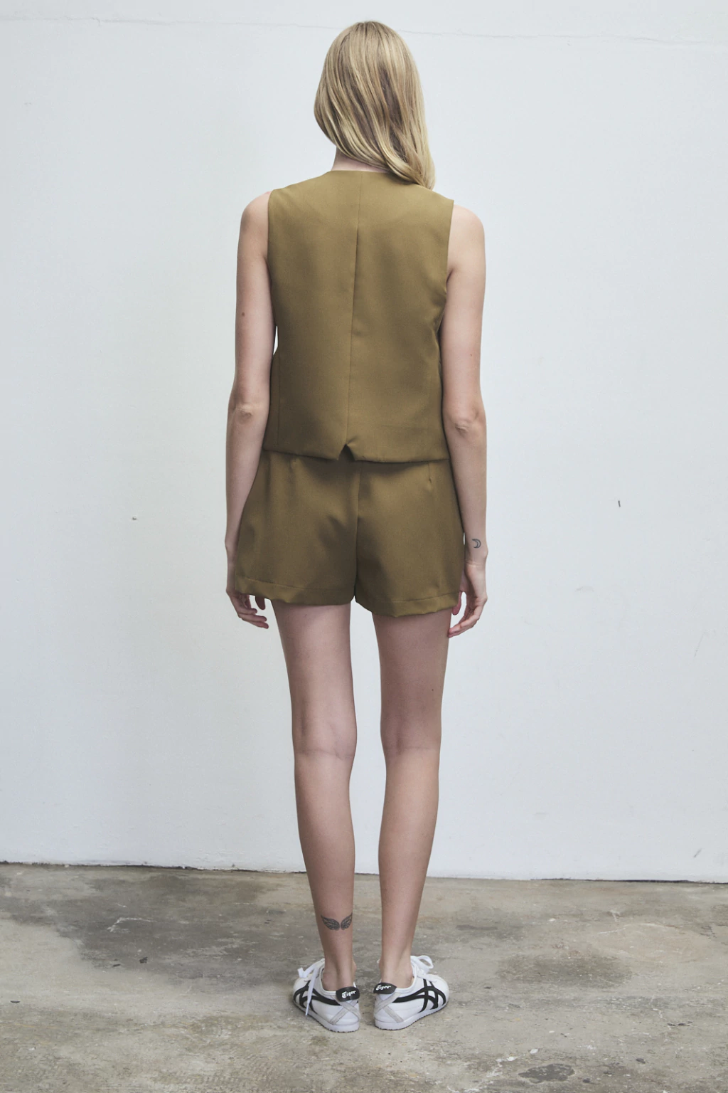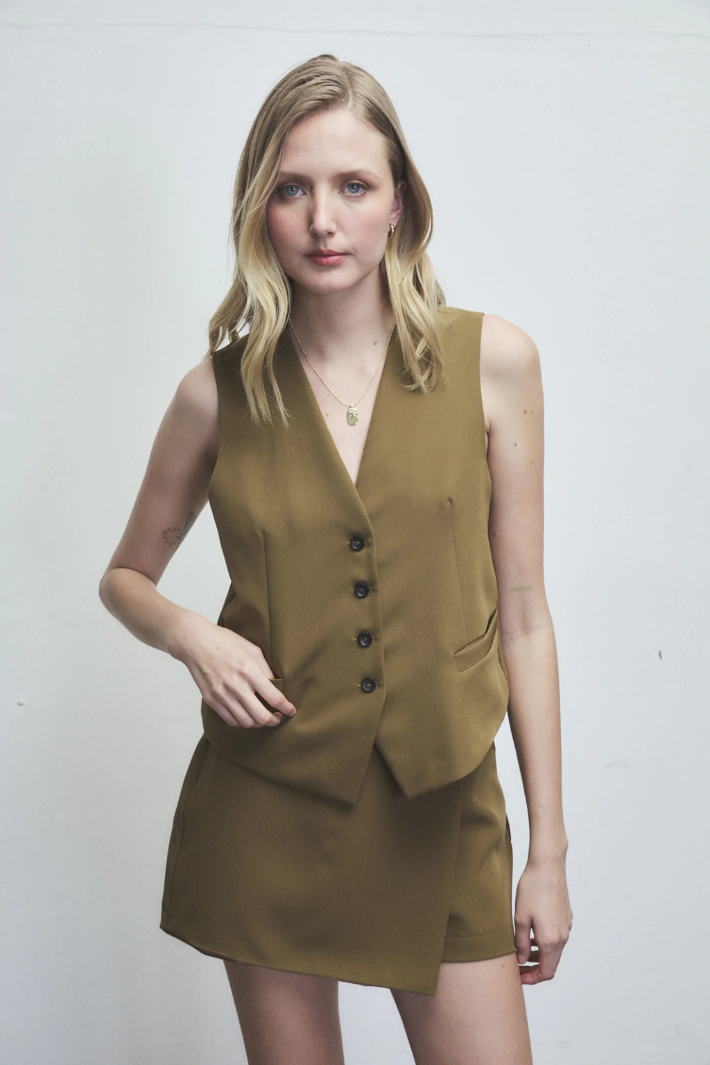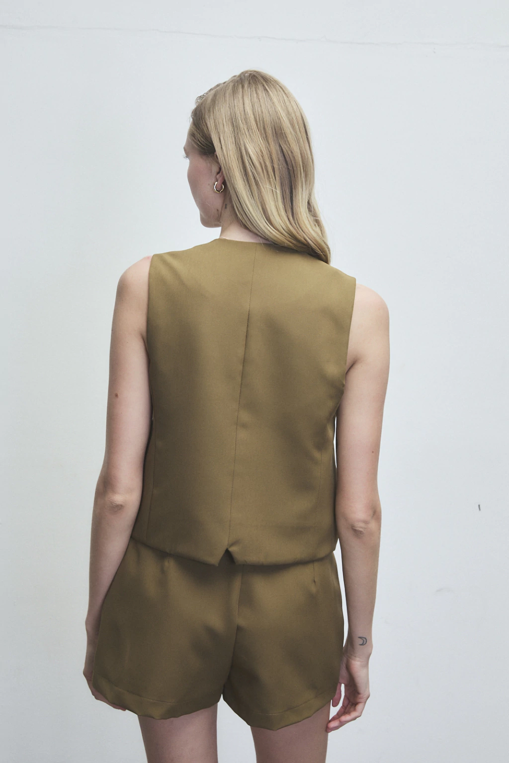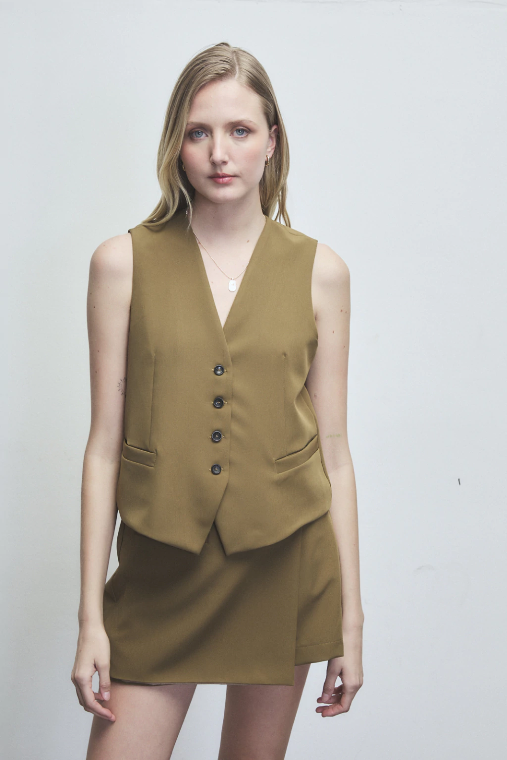 Chaleco Sastrero. Calce ligeramente entallado y escote en V, posee 4 botones lineales que prenden al centro, bolsillo ojal decorativo a los costados. Espaldín interno en tela base. La prenda está totalmente forrada.