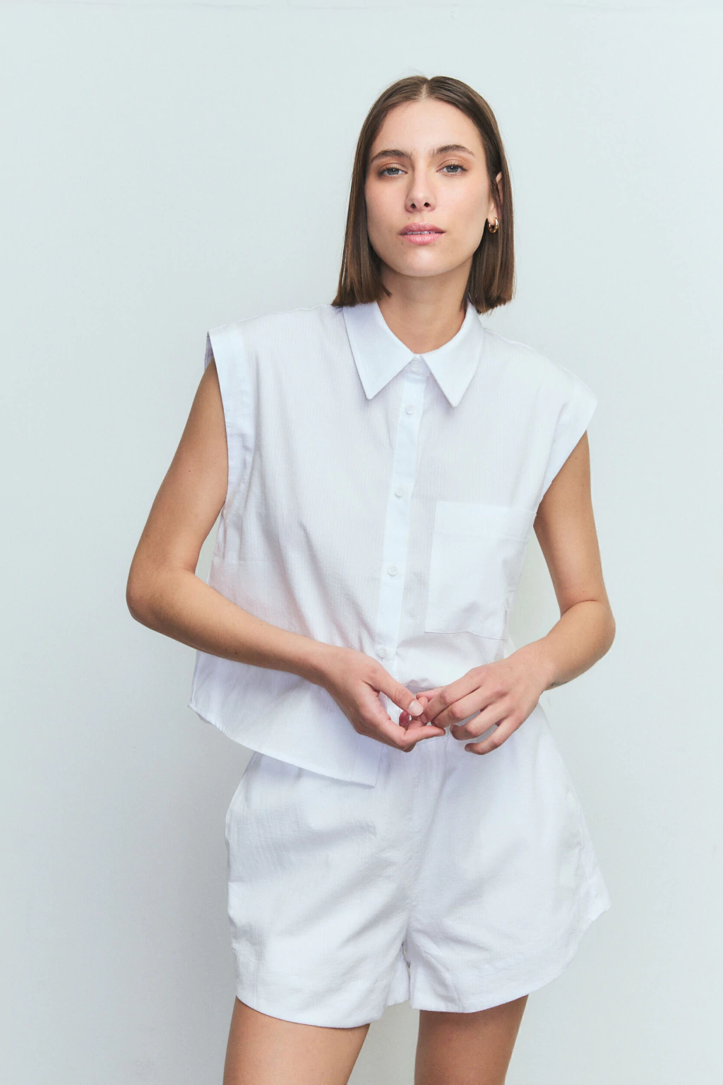 Camisa Carmen: Camisa de silueta recta sin mangas. Bolsillo plaqué en delantero con detalle de bordado a tono.