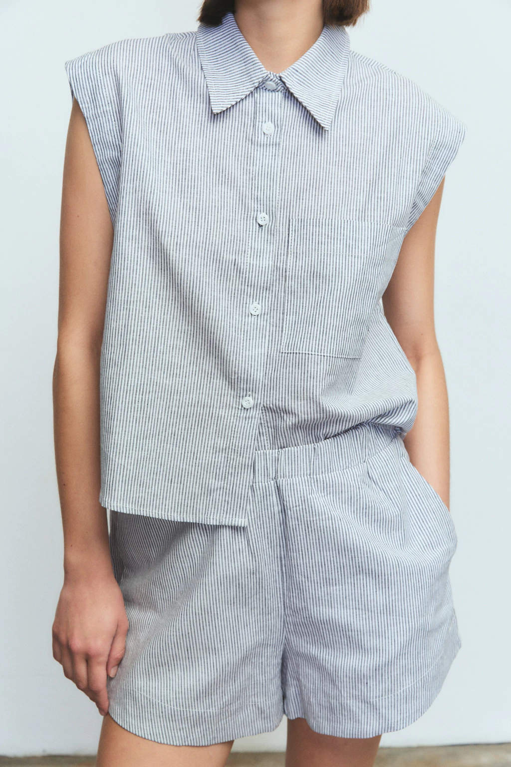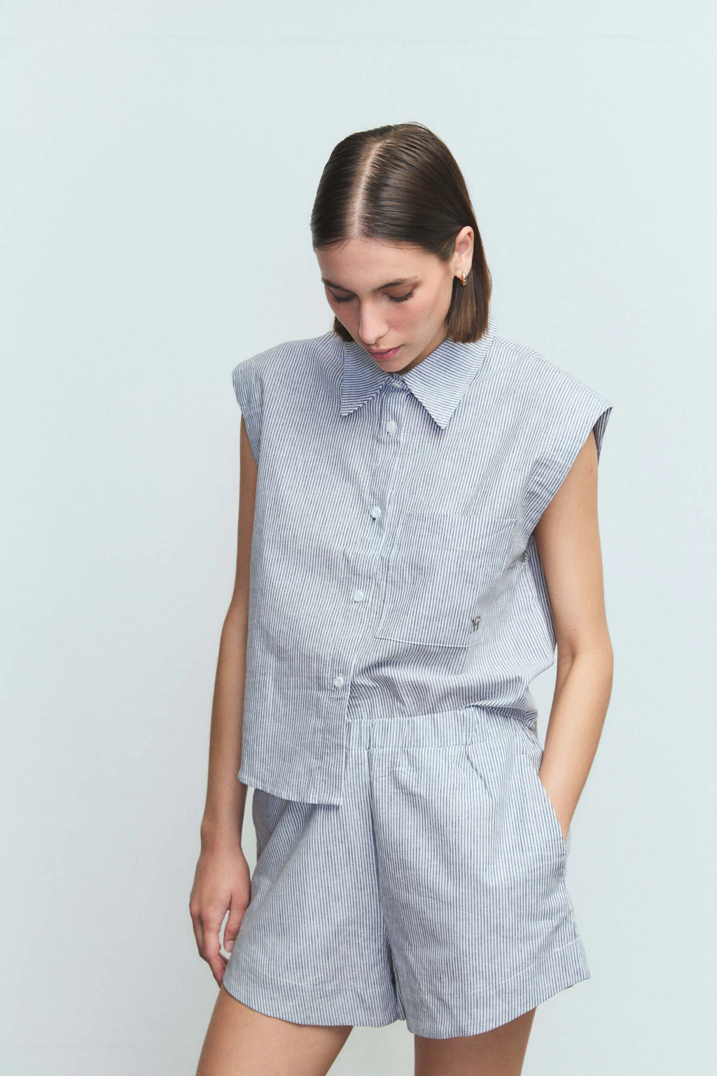 Camisa Carmen: Camisa de silueta recta sin mangas. Bolsillo plaqué en delantero con detalle de bordado a tono.
