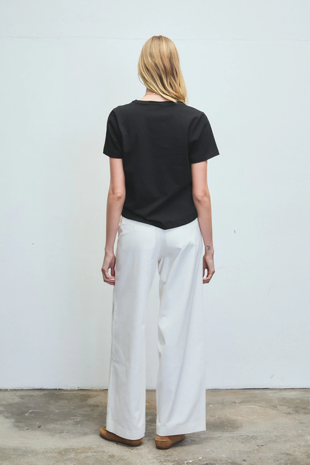 Pantalon de tiro alto/medio con calce holgado de bota amplia. Cuenta con bolsillos en laterales y cintura rígida con presillas para usar con cinto. Acceso a la prenda con cierre y botón.