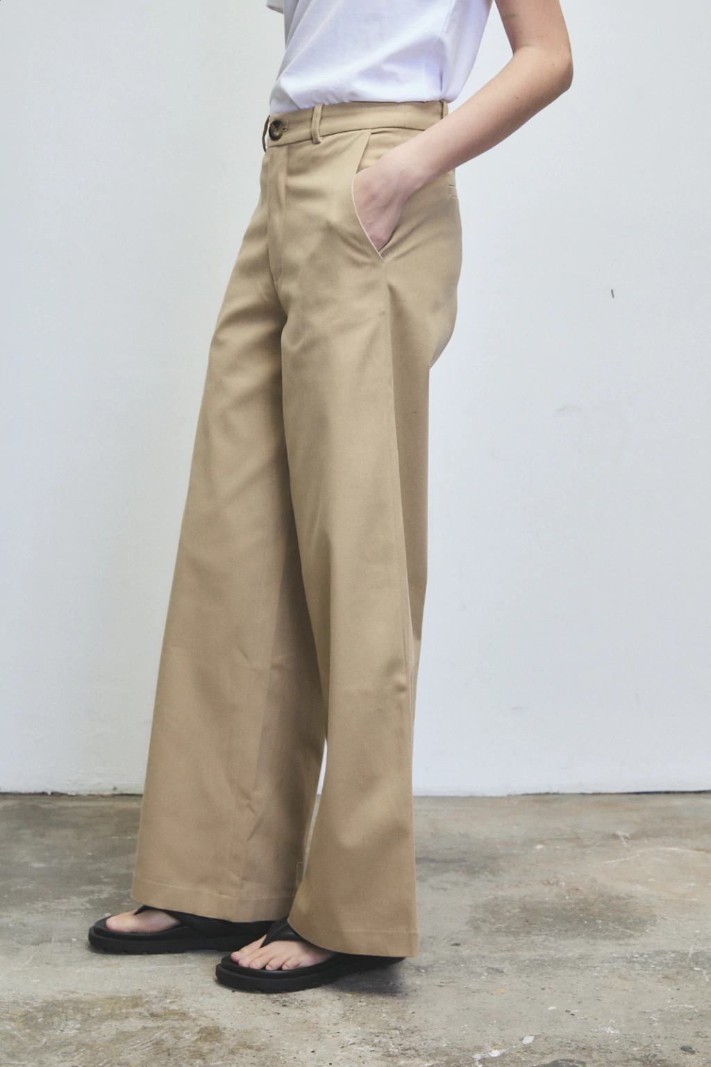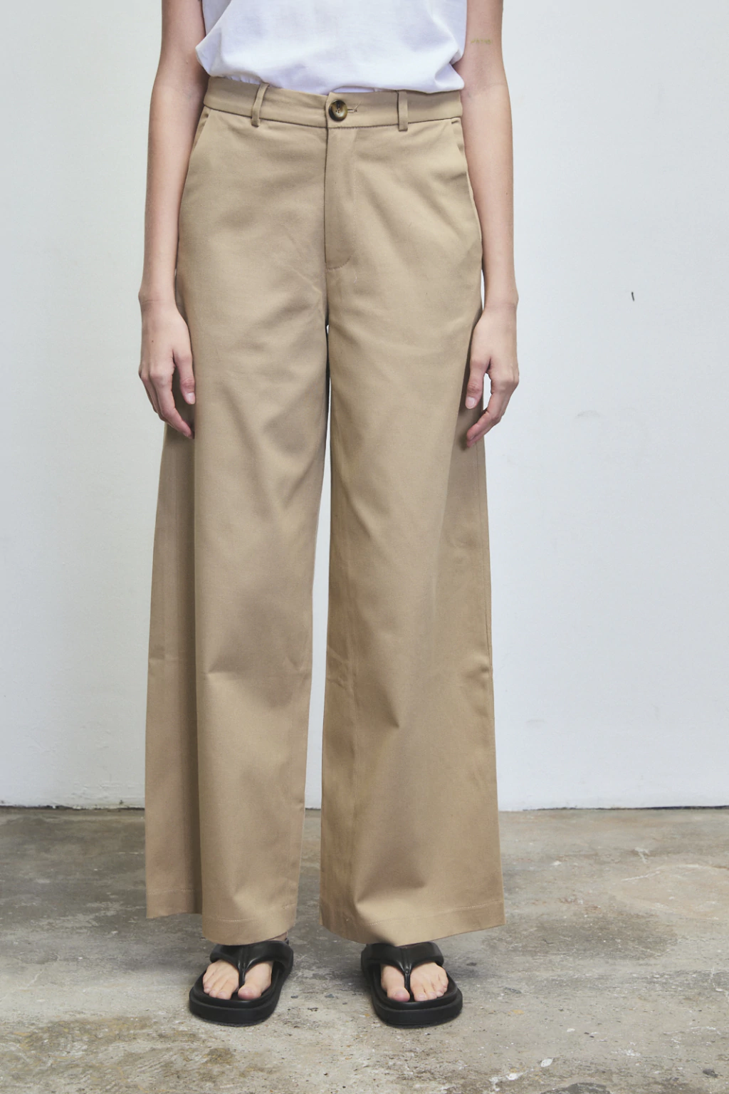 Pantalon de tiro alto/medio con calce holgado de bota amplia. Cuenta con bolsillos en laterales y cintura rígida con presillas para usar con cinto. Acceso a la prenda con cierre y botón.