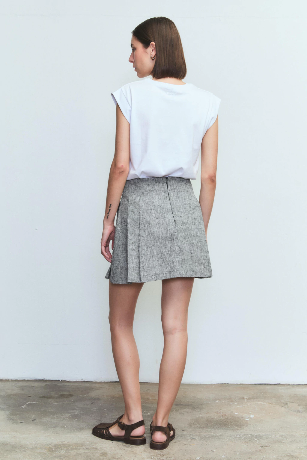 Pollera corta con tablas de tiro alto con cintura interna y cierre invisible en espalda. Calce en A.