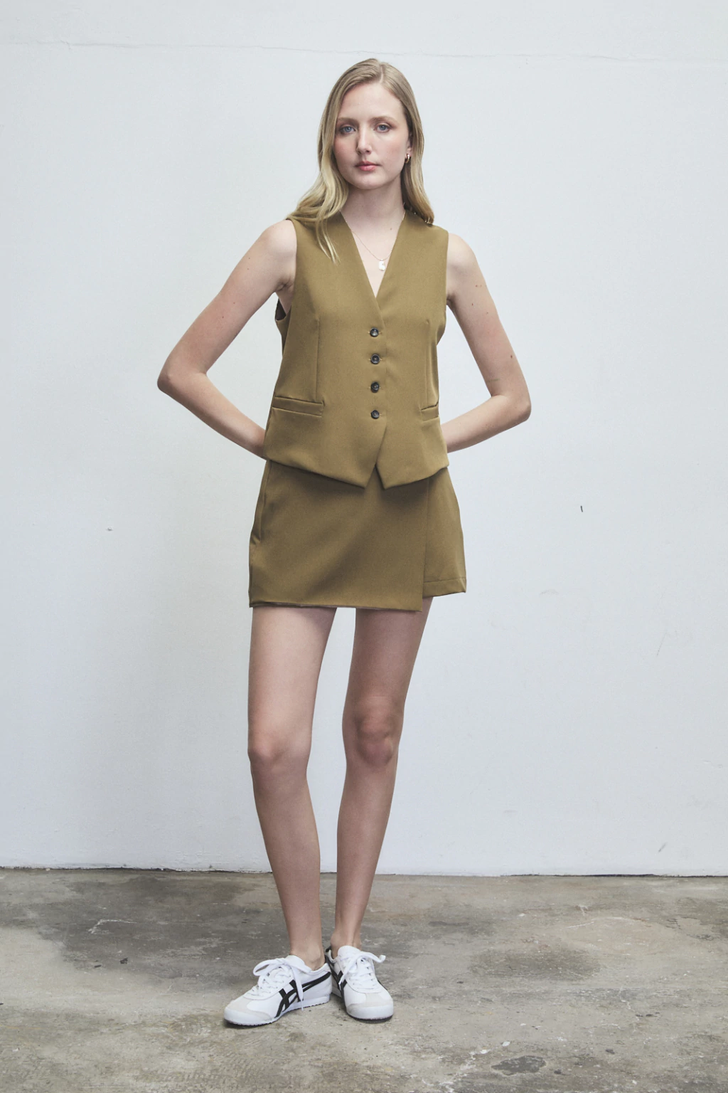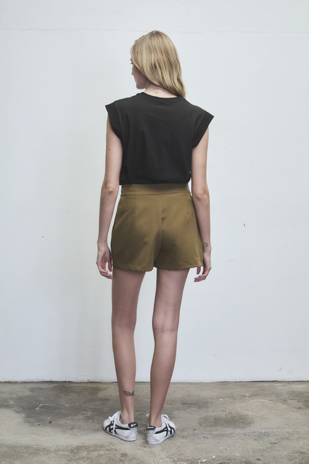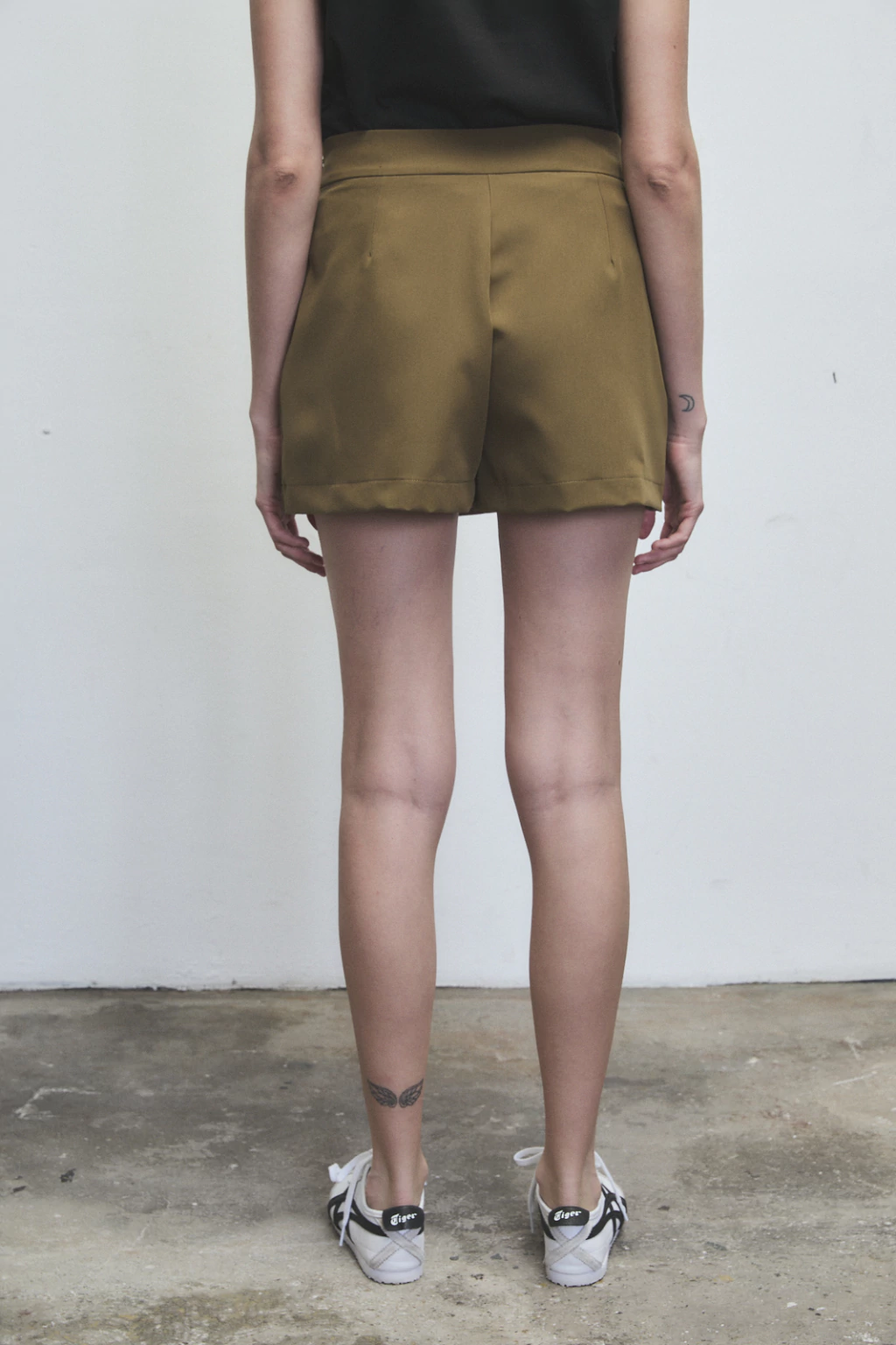 Pollera/short corta de tiro medio/alto. Su cintura rígida posee una solapa con abotonadura asimétrica a un costado. Tiene bolsillos ojal frontales en ambos costados. Cierre invisible a un costado para facil acceso a la prenda.
