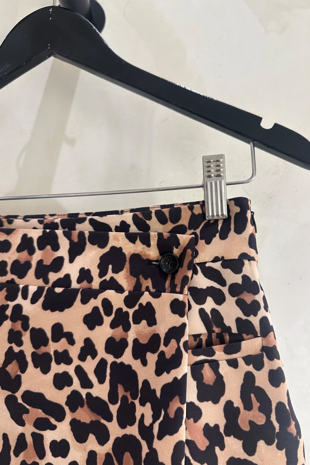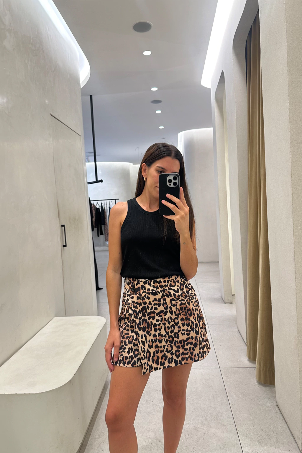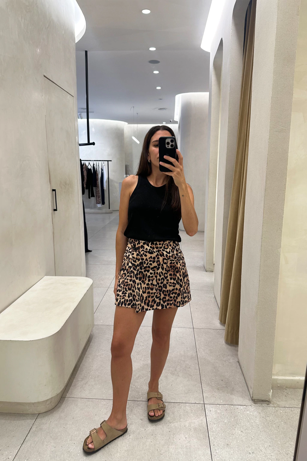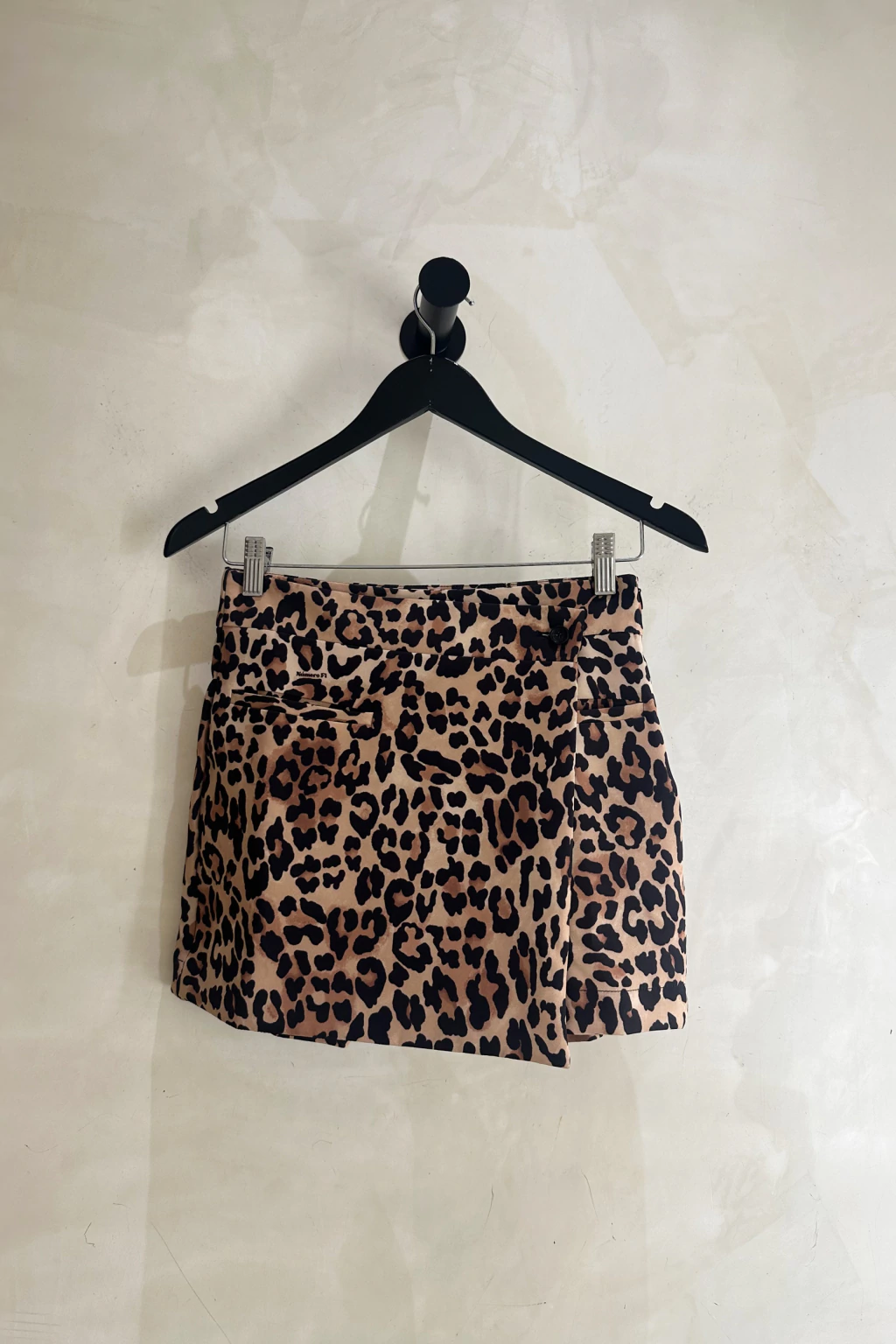 Pollera/short corta de tiro medio, su cintura rígida posee una solapa que se obotona de forma asimétrica a un costado. Tiene cierre invisible en lateral para colocar cómodamente. Posee bolsillos ojal en ambos lados frontales.