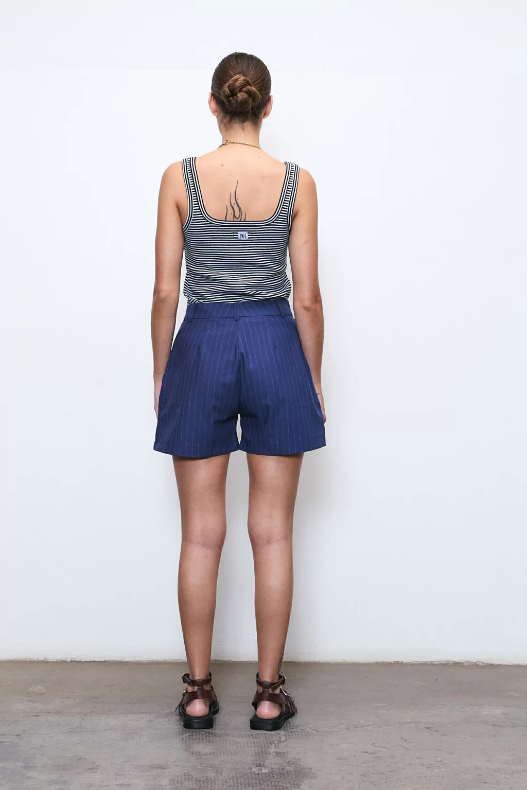 Short corto de tiro medio/alto, cintura rígida con presillas, botón y cierre. Tiene pinzas posteriores y Bolsillos laterales.