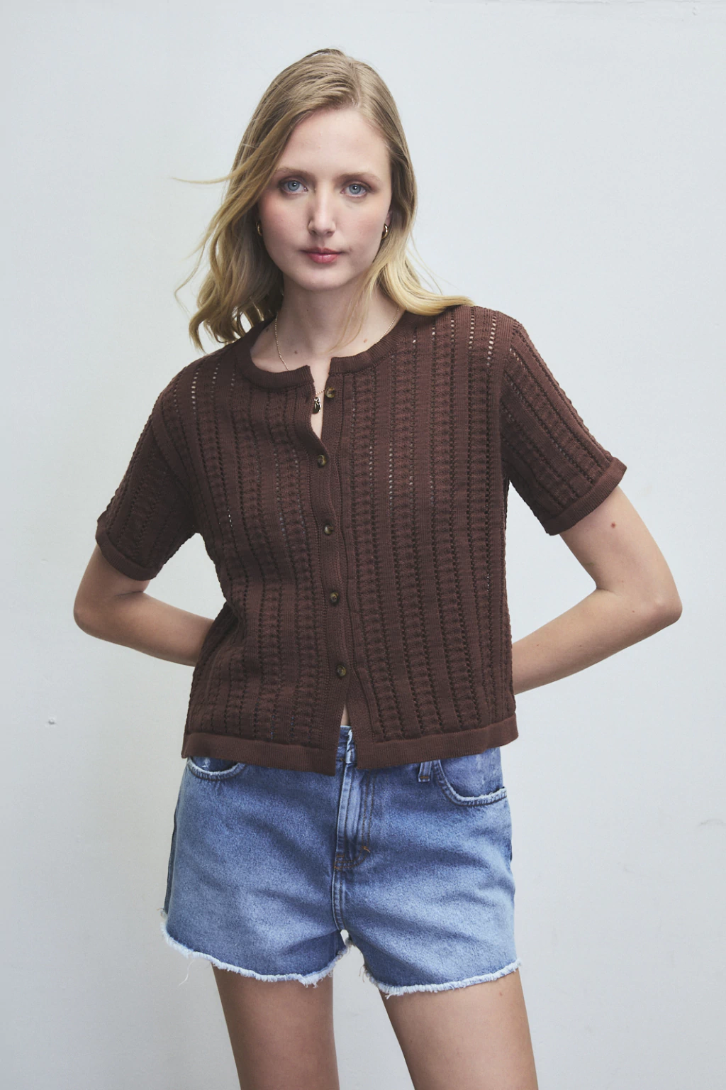 Sweater manga corta calado. Prende en el centro con cartera de botones. Largo a la cadera. Detalle de etiqueta NUMEROFI en espalda.