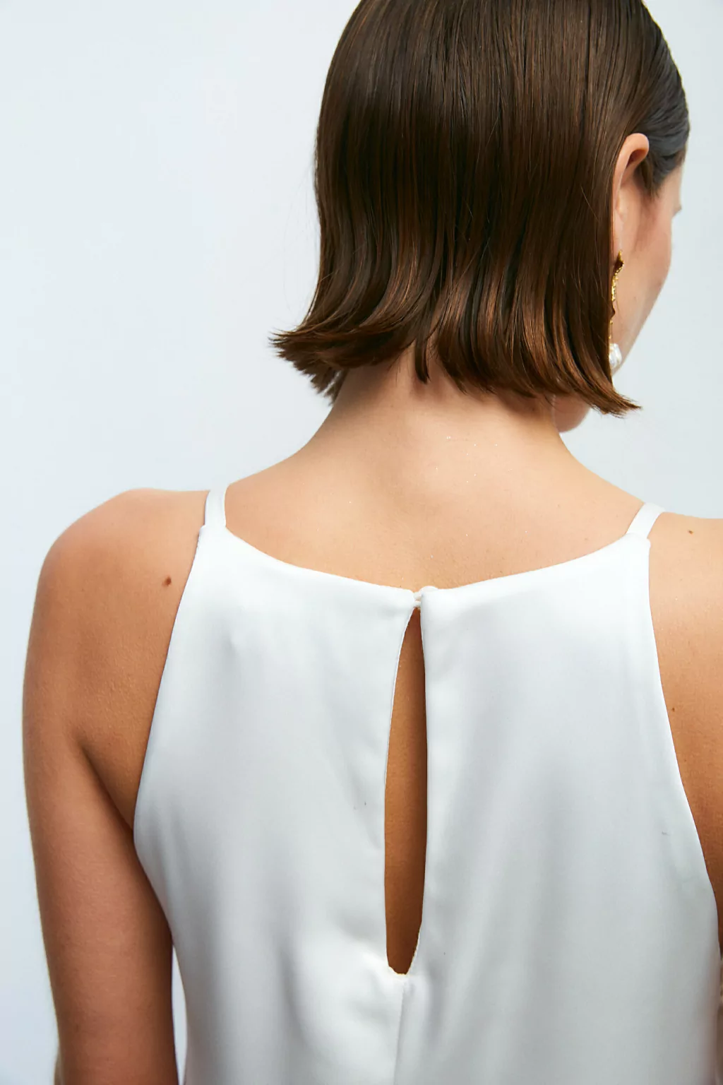 Vestido midi de cuello halter. Espalda con botón y detalle de gota. Ruedo con tajo en los laterales.